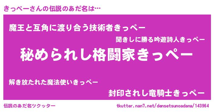 | 意味不明あだ名 | 『めかぶ科きっぺー属』『自称きっぺー』 |