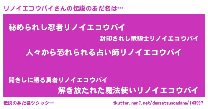| 男性向けラノベタイトル風あだ名 | 『魔弾の王とリノイエコウバイ』 |