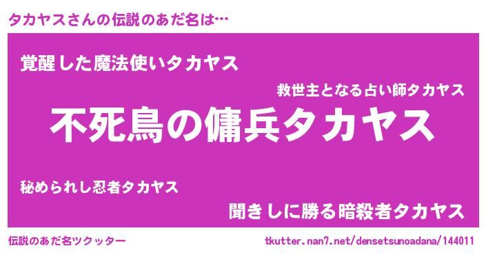 | 男性向けラノベタイトル風あだ名 | 『転生したらタカヤスだった件』 |