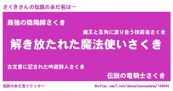 | 女子向けラノベタイトル風あだ名 | 『さくきの卵を拾いまして』 |