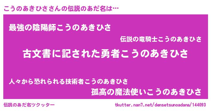 | 女子向けラノベタイトル風あだ名 | 『こうのあきひさの玉の輿計画!』 |