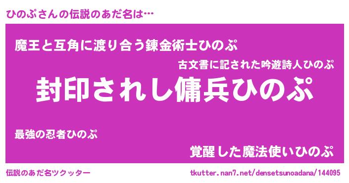 | 男性向けラノベタイトル風あだ名 | 『Re:ひのぷから始める異世界生活』 |