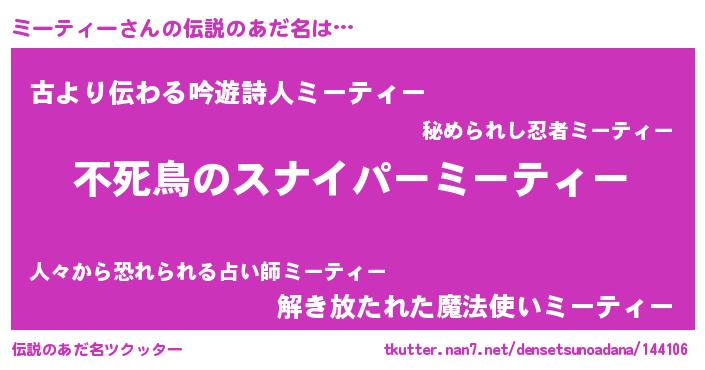 | 胡散臭い通販商品みたいなあだ名 | 『モテモテ間違いなし霊験あらたかなお札…その名も「ミーティー」』 |