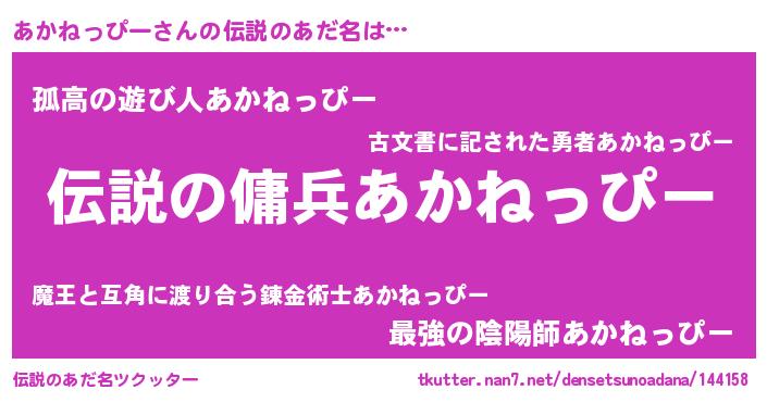 | ヒーロー風カッコイイあだ名 | 『スーパーアカネッピー』『幻影騎士アカ』 |