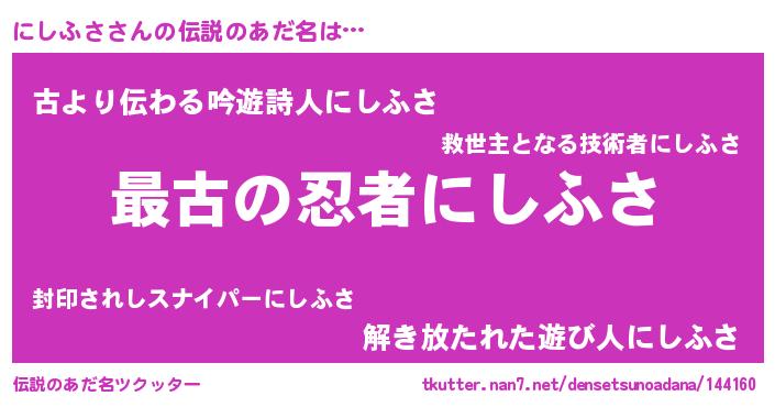 | 男性向けラノベタイトル風あだ名 | 『Re:にしふさから始める異世界生活』 |