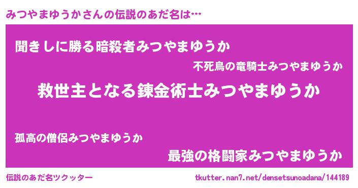 | 男性向けラノベタイトル風あだ名 | 『うちのみつやまゆうかが世界を掌握している!』 |