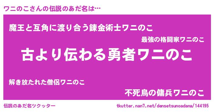 | 胡散臭い通販商品みたいなあだ名 | 『来世でも幸せになれる水素水…その名も「ワニのこ」』 |
