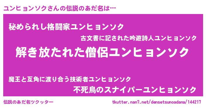| 男性向けラノベタイトル風あだ名 | 『ダンジョンにユンヒョンソクを求めるのは間違っているだろうか』 |
