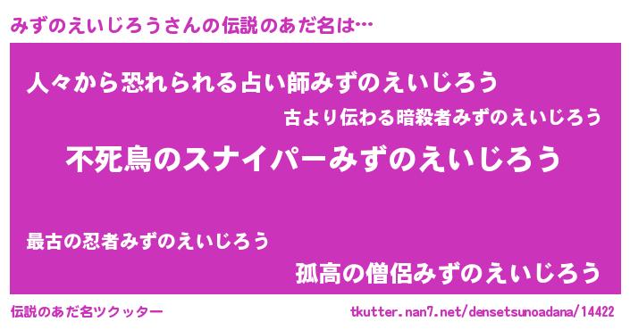 | 胡散臭い通販商品みたいなあだ名 | 『モテモテ間違いなし霊験あらたかなお札…その名も「みずのえいじろう」』 |