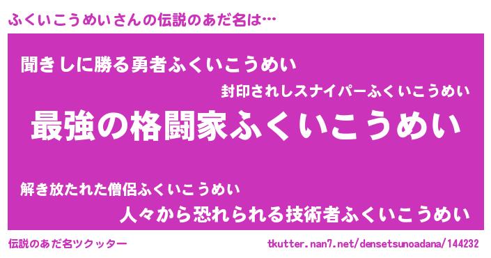 | 胡散臭い通販商品みたいなあだ名 | 『あなたにだけ特別に提供する100年もののヴィンテージワイン…その名も「ふくいこうめい」』 |