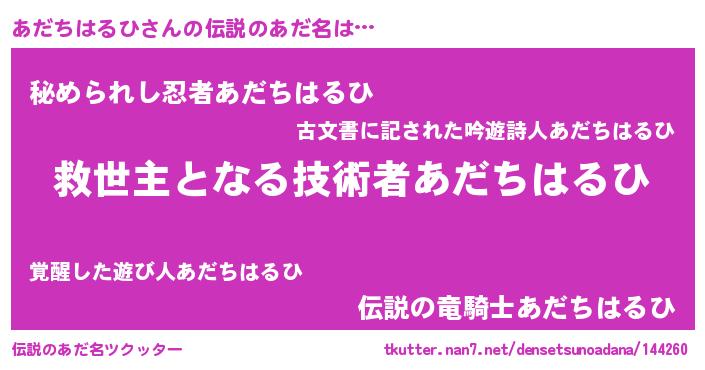| 男性向けラノベタイトル風あだ名 | 『あだちはるひに滅ぼされるだけの簡単なお仕事です』 |