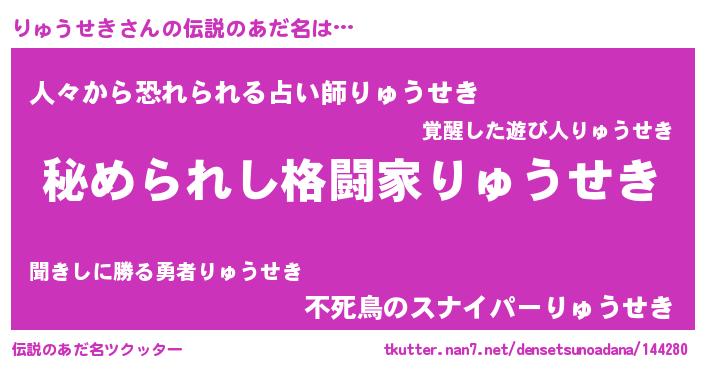 | ヒーロー風カッコイイあだ名 | 『仮面リュダー』『正義の使者りゅうせき』 |