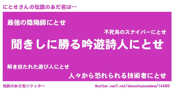 | 意味不明あだ名 | 『永久保存にとせ』『にとせフォーエバー』 |
