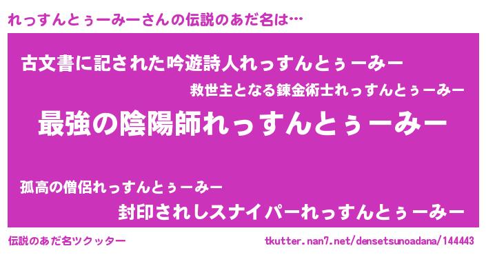 | 意味不明あだ名 | 『自称れっすんとぅーみー』 |