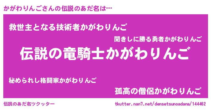 | ヒーロー風カッコイイあだ名 | 『スーパーカガワリンゴ』『魔戒騎士カガ』 |