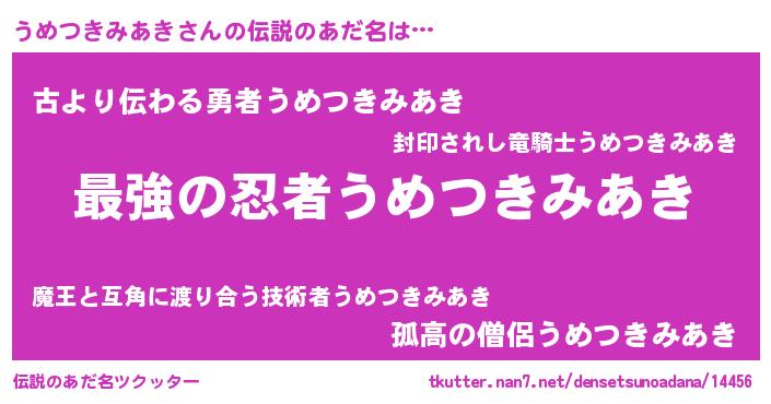 | 男性向けラノベタイトル風あだ名 | 『うちのうめつきみあきが世界を掌握している!』 |