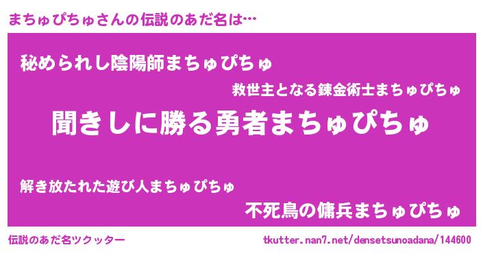 | 胡散臭い通販商品みたいなあだ名 | 『絶対に幸福をもたらす水素水…その名も「まちゅぴちゅ」』 |