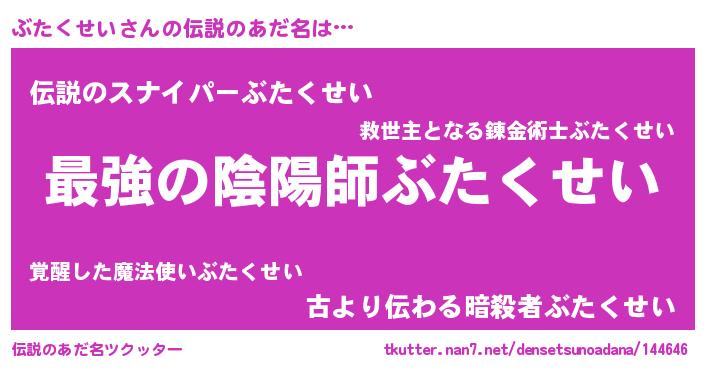 | 男性向けラノベタイトル風あだ名 | 『ぶたくせい~年齢イコール彼女いない歴の魔法使い~』 |