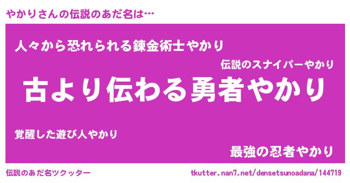 | 女子向けラノベタイトル風あだ名 | 『やかりの契約王妃』『死神やかりの再婚』 |
