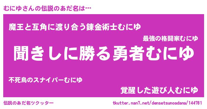 | 男性向けラノベタイトル風あだ名 | 『ムニユスレイヤー』『魔弾の王とむにゆ』 |