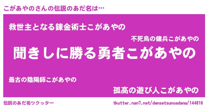 | 男性向けラノベタイトル風あだ名 | 『こがあやのという概念が存在しない退屈な世界 』 |