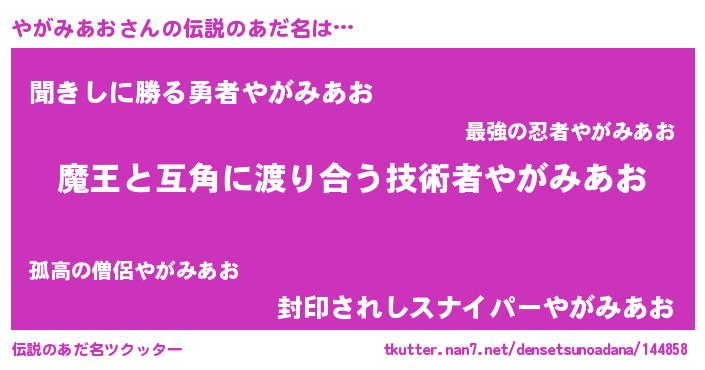 | ヒーロー風カッコイイあだ名 | 『慈愛の使者やがみあお』『天弓騎士ヤガ』 |