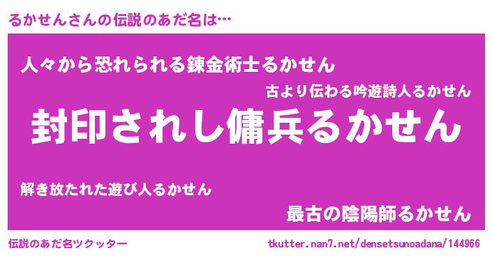 | 男性向けラノベタイトル風あだ名 | 『るかせんに滅ぼされるだけの簡単なお仕事です』 |