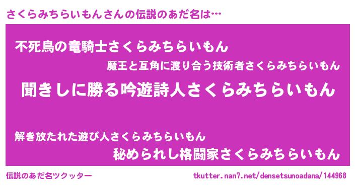 | 女子向けラノベタイトル風あだ名 | 『さくらみちらいもんなんてお断りですっ。』 |