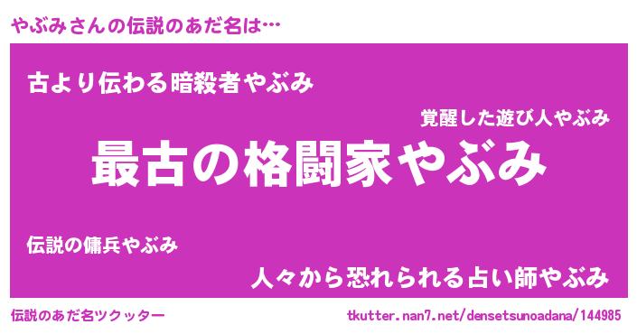| 男性向けラノベタイトル風あだ名 | 『うちの娘の為ならば、俺はもしかしたらやぶみも倒せるかもしれない。』 |