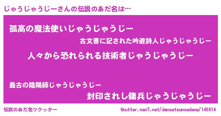| 男性向けラノベタイトル風あだ名 | 『おまえをオタクにしてやるから、俺をじゃうじゃうじーにしてくれ! 』 |