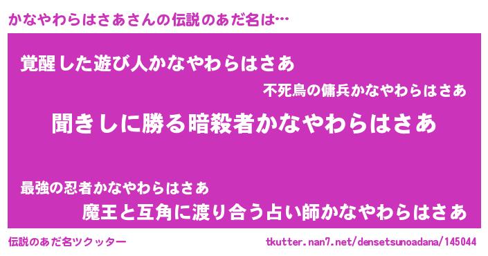 | ヒーロー風カッコイイあだ名 | 『ネオカナヤワラハサア』『天弓騎士カナ』 |