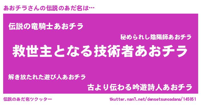 | ヒーロー風カッコイイあだ名 | 『天空の使者あおチラ』『ネオアオチラ』 |