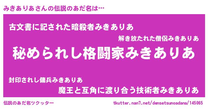 | 意味不明あだ名 | 『自称みきありあ』『永久保存みきありあ』 |