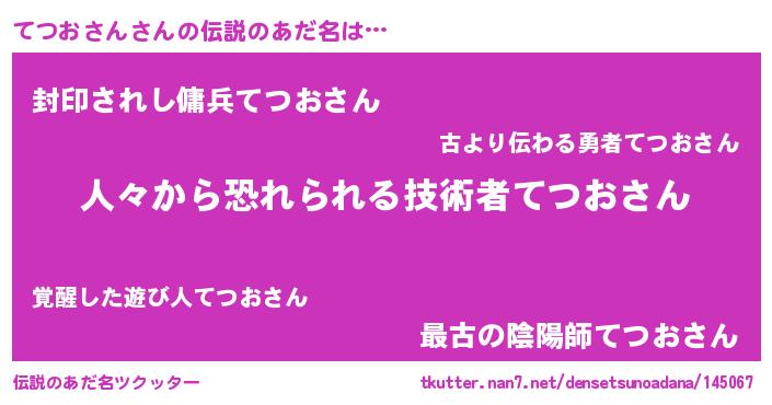 | 男性向けラノベタイトル風あだ名 | 『おまえをオタクにしてやるから、俺をてつおさんにしてくれ! 』 |