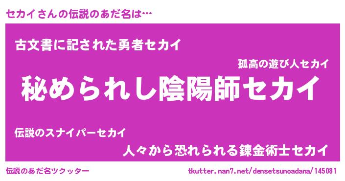 | 男性向けラノベタイトル風あだ名 | 『セカイスレイヤー』『緋弾のセカイ』 |