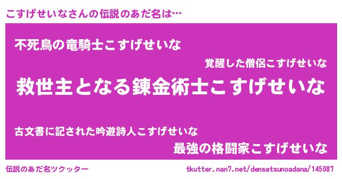 | 男性向けラノベタイトル風あだ名 | 『こすげせいな~年齢イコール彼女いない歴の魔法使い~』 |