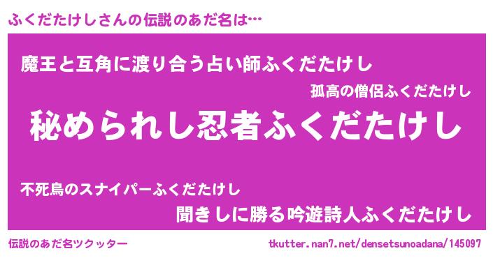 | 男性向けラノベタイトル風あだ名 | 『魔弾の王とふくだたけし』 |