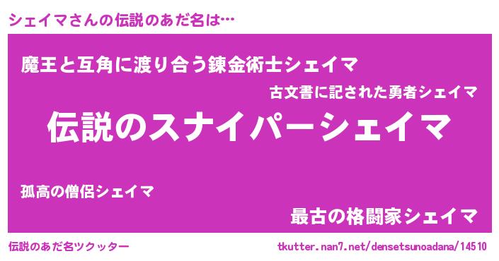 | 男性向けラノベタイトル風あだ名 | 『魔法科高校のシェイマ』 |