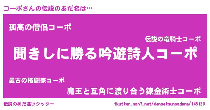 | 男性向けラノベタイトル風あだ名 | 『コーポという概念が存在しない退屈な世界 』 |