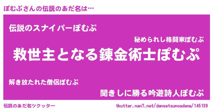 | 胡散臭い通販商品みたいなあだ名 | 『あなたにだけ特別に提供する世界で10本だけ現存している希少なブランデー…その名も「ぽむぷ」』 |