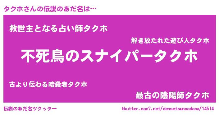 | ヒーロー風カッコイイあだ名 | 『サイバー戦士タクホ』『スーパータクホ』 |