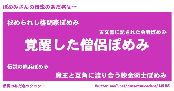 | 女子向けラノベタイトル風あだ名 | 『ぽめみ様がみてる』『ぽめみ伯爵の花嫁』 |