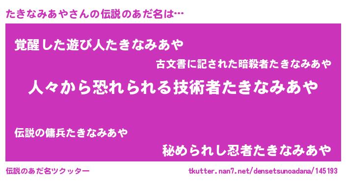 | 男性向けラノベタイトル風あだ名 | 『タキナミアヤスレイヤー』 |