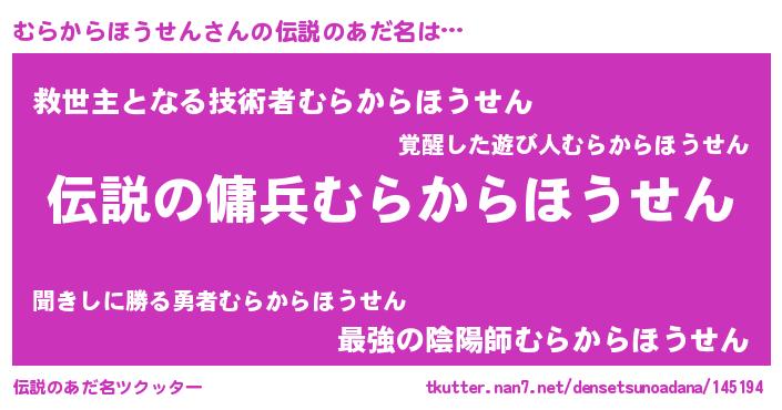| 男性向けラノベタイトル風あだ名 | 『むらからほうせんの憂鬱』 |