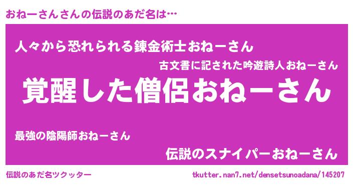 | ヒーロー風カッコイイあだ名 | 『最強戦士オネーサン』『暗黒騎士オネ』 |