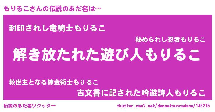 | 男性向けラノベタイトル風あだ名 | 『もりるこに滅ぼされるだけの簡単なお仕事です』 |