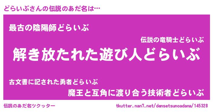 | ヒーロー風カッコイイあだ名 | 『幻影騎士ドラ』『ウルトラどらいぶマン』 |