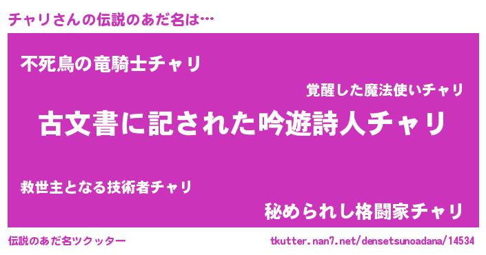 | 胡散臭い通販商品みたいなあだ名 | 『あなたにだけ特別に提供する100年もののヴィンテージワイン…その名も「チャリ」』 |