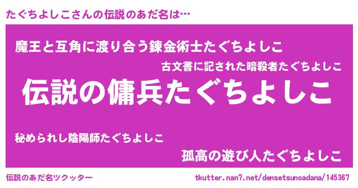 | ヒーロー風カッコイイあだ名 | 『スーパータグチヨシコ』『暗黒騎士タグ』 |