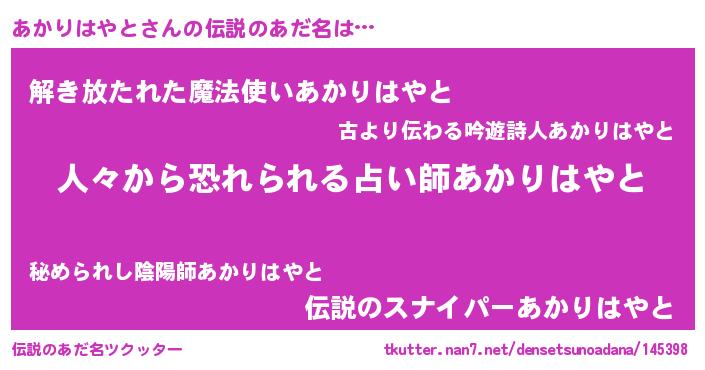 | 男性向けラノベタイトル風あだ名 | 『おまえをオタクにしてやるから、俺をあかりはやとにしてくれ! 』 |